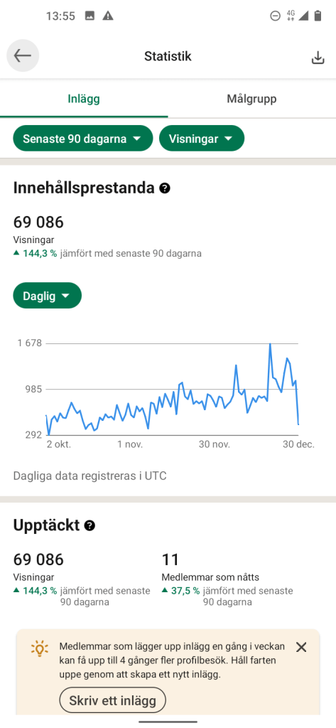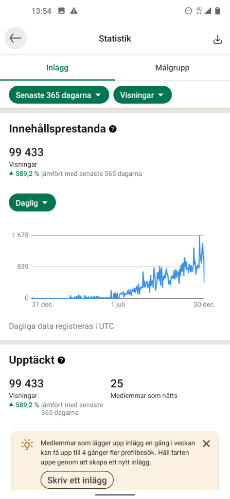 Det halka med ett inlägg på drygt 8 tusen Visningar, det är flera av inläggen som är över 8 tusen hur kul som helst, 😊 speciellt när ett snitt för Visningar på LinkedIn är runt 500 stycken – det du och nu börjar det närma sig 10 tusen på några inlägg.