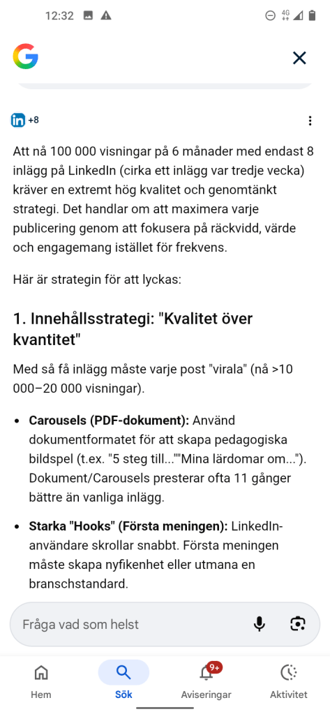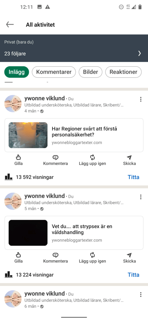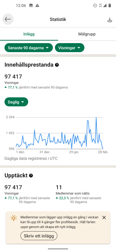 Idag 28/2-26 är 8 inlägg uppe i 100 270 Tusen Visningar, 4 inlägg över 13 tusen Visningar 2 inlägg över 12 tusen Visningar. 2 inlägg över 11 tusen Visningar, blir över 💯 Tusen Visningar.Uppdateringarna finns , fast det är en bedrift av mig, att skriva totalt 16 inlägg och då 8 av dem är över 💯 Tusen Visningar, de andra 8 är också långt över snittet för Visningar – Kul!!! Återstår att fortsätta skriva på den här nivån.