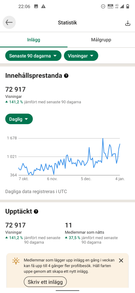 SÄ mÄnga Visningar, otroligt, LinkedIn, pÄ den hÀr sidan mÄste man ha Seo plugin som jag nÀmnt tidigare ( som jag inte har) för att synas och det Àr inte sÀkert att man gör det ÀndÄ., sÄ kan det vara, sÄ ni som Àr hÀr hur hittade ni hit? Spela roll ni kanske hoppar mellan olika.