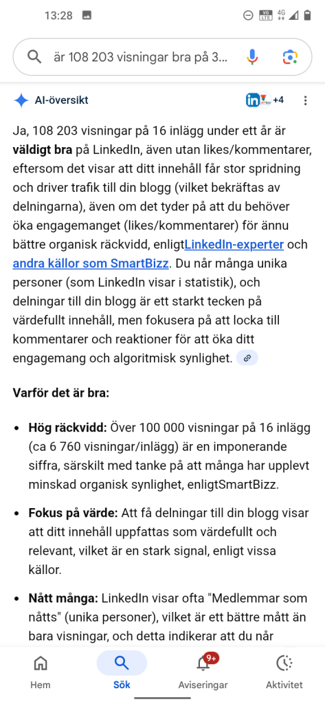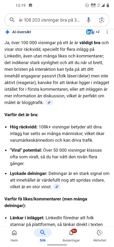 Coolt eller hur? ville läsa lite om alla visningar, var jag hamnar även fast jag har haft ungefär samma funderingar. Att få kommentarer är nog inte mitt syfte för att skriva, men visst vore det roligt att få ett gilla mellan varven så det inte hela tiden står på katastrofens rand. Larva mig men inte med likes, fast å andra sidan så är det roligast med visningar och delningar och du som läsare har den tysta konsumtionen – läsa och gå vidare eller…..