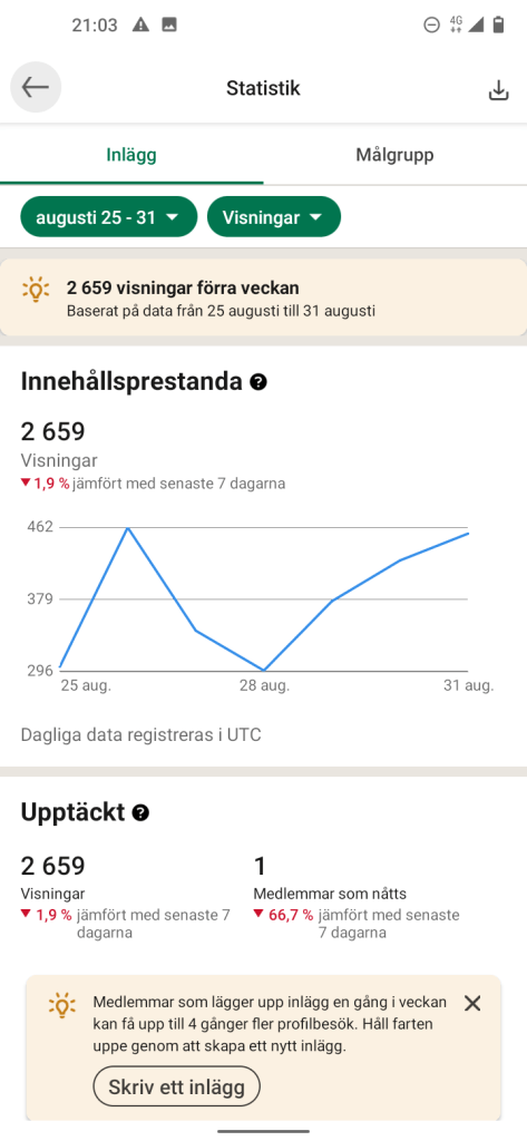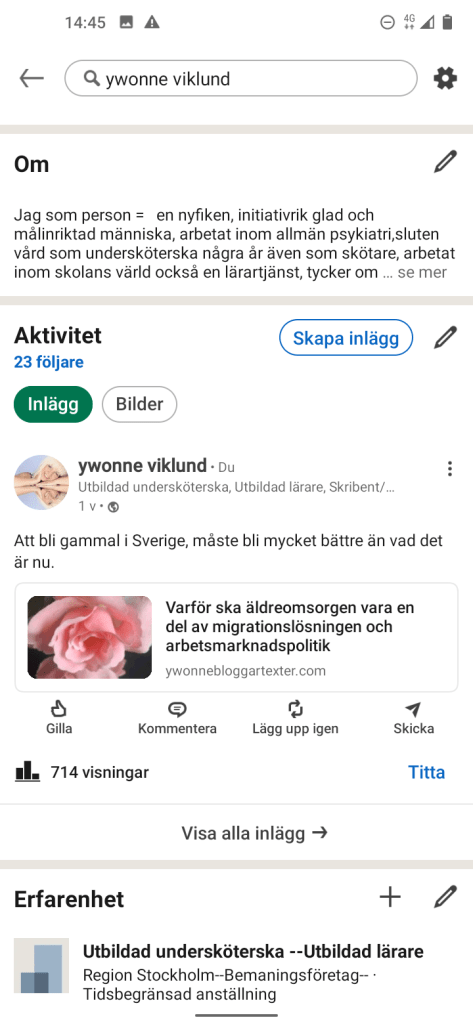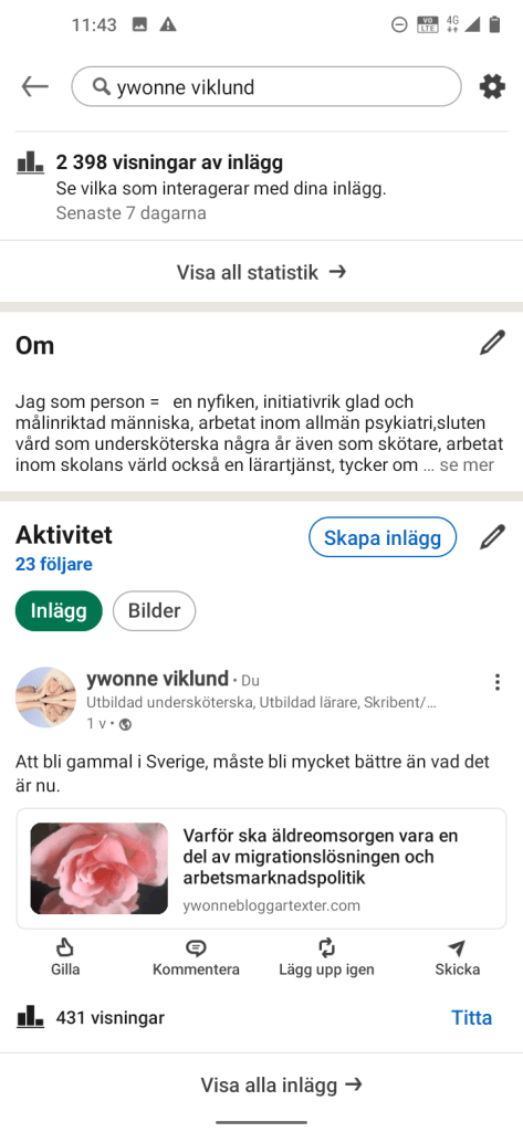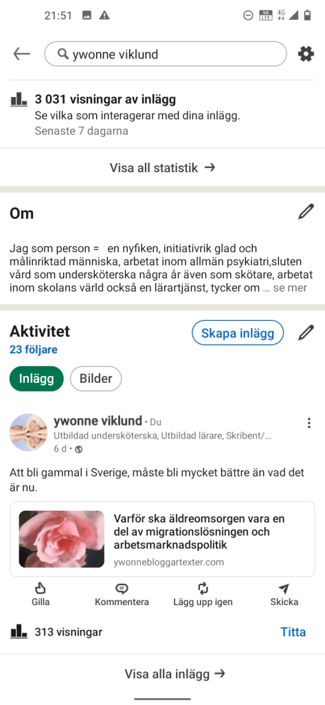 Totalt idag 24 863 Visningar av 11 inlägg på LinkedIn, här är jag uppe i närmare eller om det är över 50 inlägg OCH det är knappast några tusental så att säga, man får vara glad för det lilla Äh självklart vill jag att det ska öka här men jag tror att det är vilket program du har köpt, det blir som det gränsas, så är det inte på LinkedIn eller min förra blogg-. Det är en tröttsam användning av ordet utmaning att få upp visningar på sidan så med andra ord du får jobba på med klickandet och läsandet.