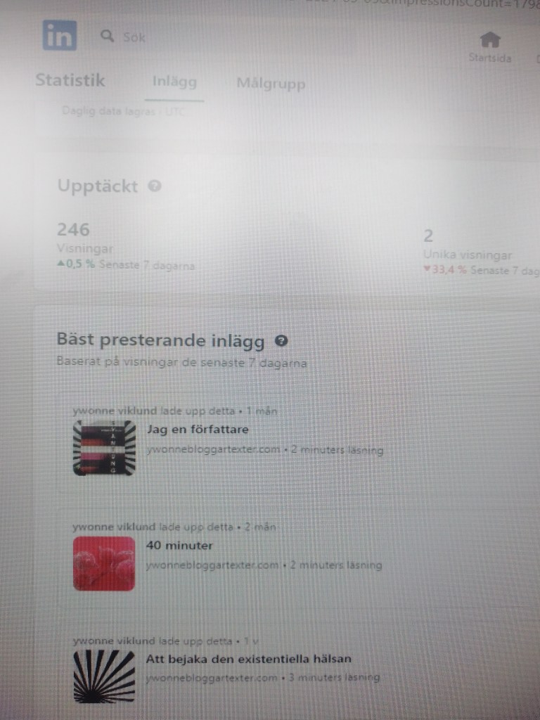 Så nu är jag tillbaka här, har varit eller rättare sagt skrivit inlägg delat på LinkedIn, mycket roligt eftersom det utmynnar i väldigt många visningar, åtta inlägg i realtid över 14 tusen visningar, sedan har de en fin strukturerad statistik som jag får.